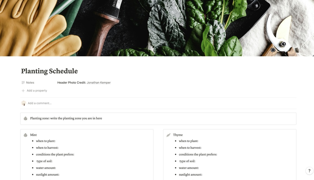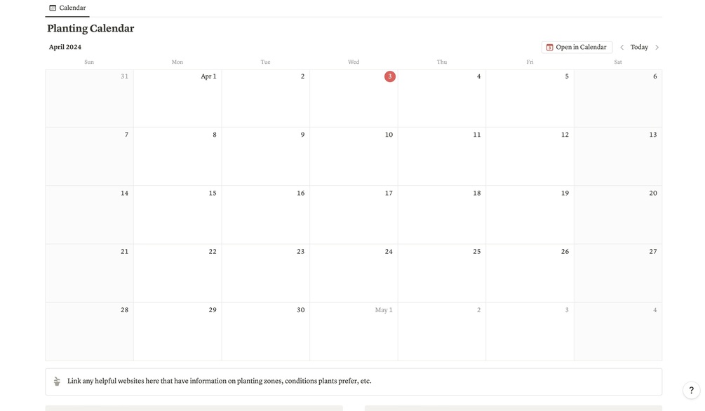 This Notion template planner is meant to help you think up and plan your dream kitchen garden! With pages dedicated to specific herbs and plants, a calendar and a page for typing up your planting schedule, this planner is perfect for anyone hoping to start a kitchen garden this spring!