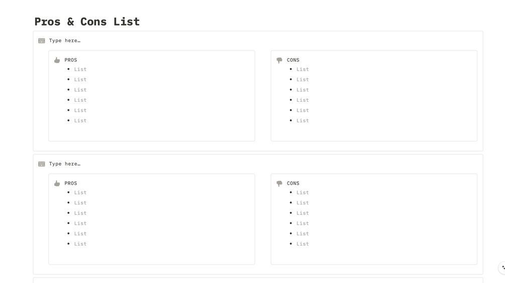 This is a simple pros and cons Notion template to help you plan out lists when making important decisions!