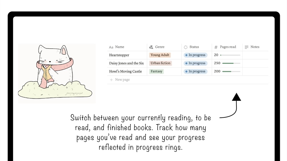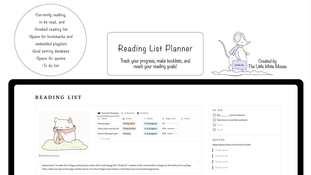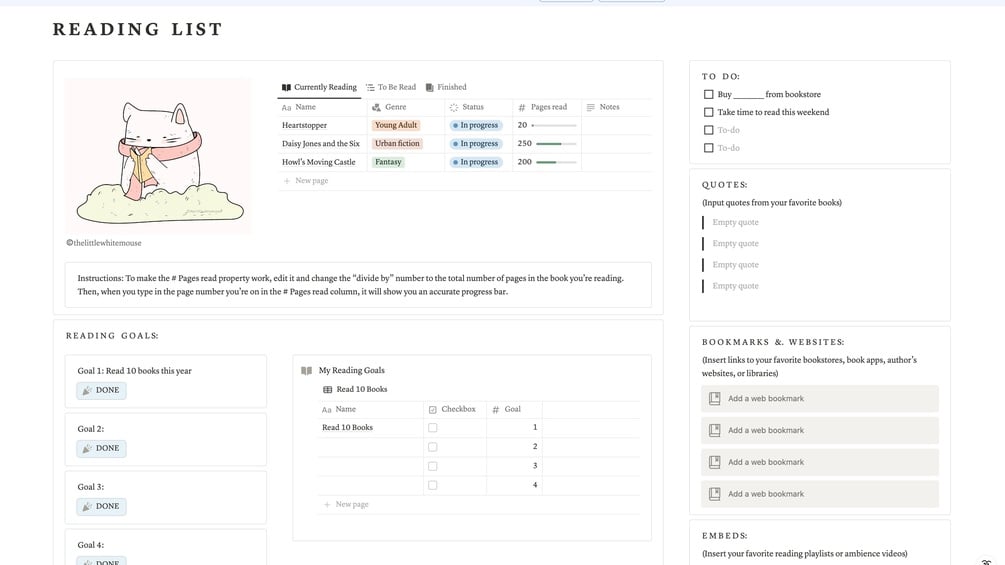 reading list, book tracker, reading planner, booklist, hobbies, goal planner, personal planer, notion template, notion dashboard)