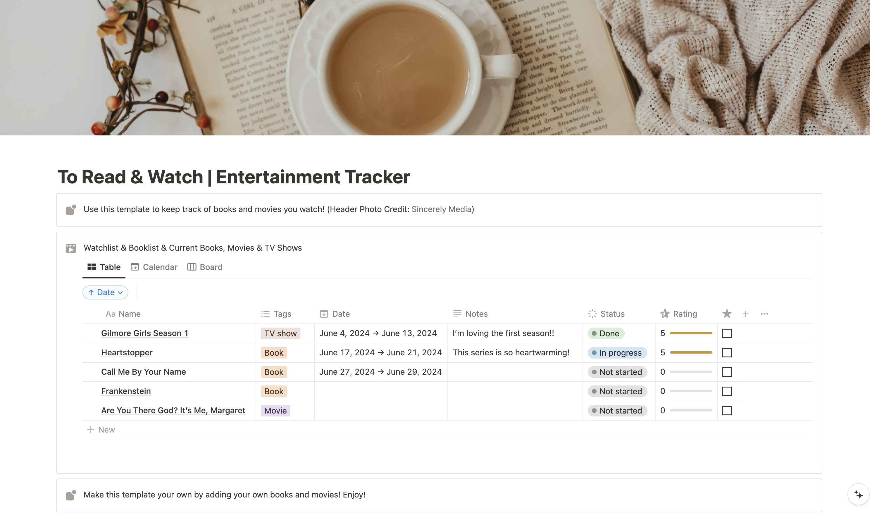 This is a simple entertainment planner/tracker to help you keep track of your current books, movies and tv shows! With a helpful database with columns dedicated to status, rating, favorite, and notes, this template offers a streamlined and easy to use experience!