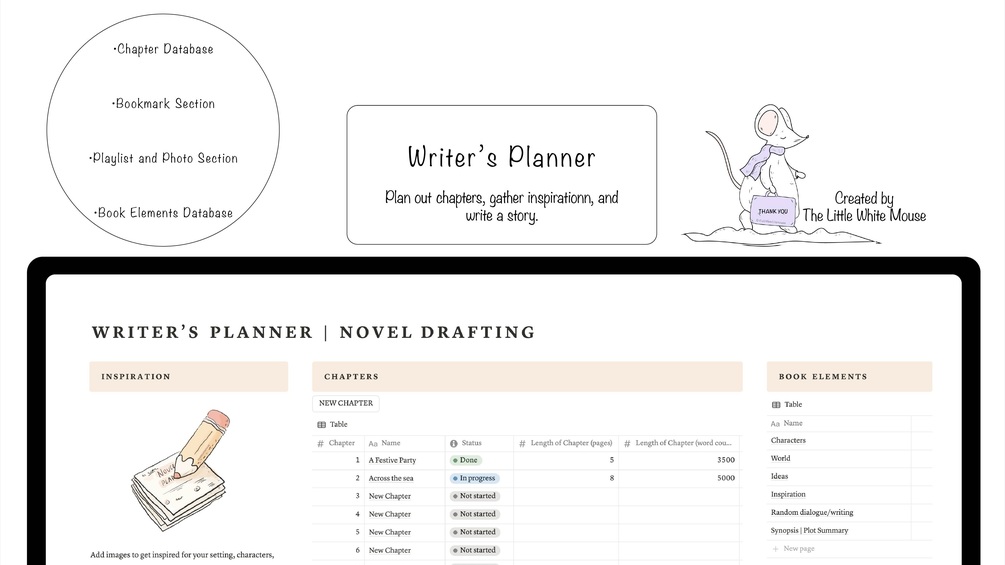Plan out your next writing project with this simple and easy to use planner. With databases dedicated to chapters, characters, ideas, and more, this template is perfect for any writer wishing to draft their book within an organized system that can be customized to their needs.